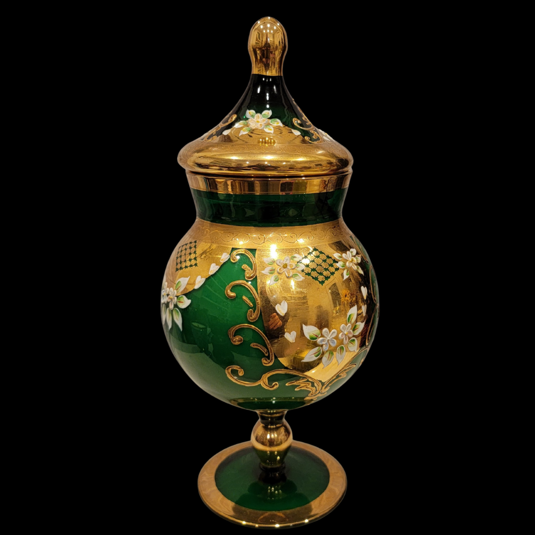 Holly is a beautiful vintage Czech enameled pedestal vessel. Rich emerald glass, lavish gold detailing, and delicately hand-enameled floral accents give this piece an heirloom quality. As the candle burns, it releases the nostalgic blend of gentle spices, evergreen notes, and sweet seasonal memories. Once the candle has finished, the vessel becomes a treasured keepsake perfect for display or storing special trinkets, adding timeless charm to your décor year round.